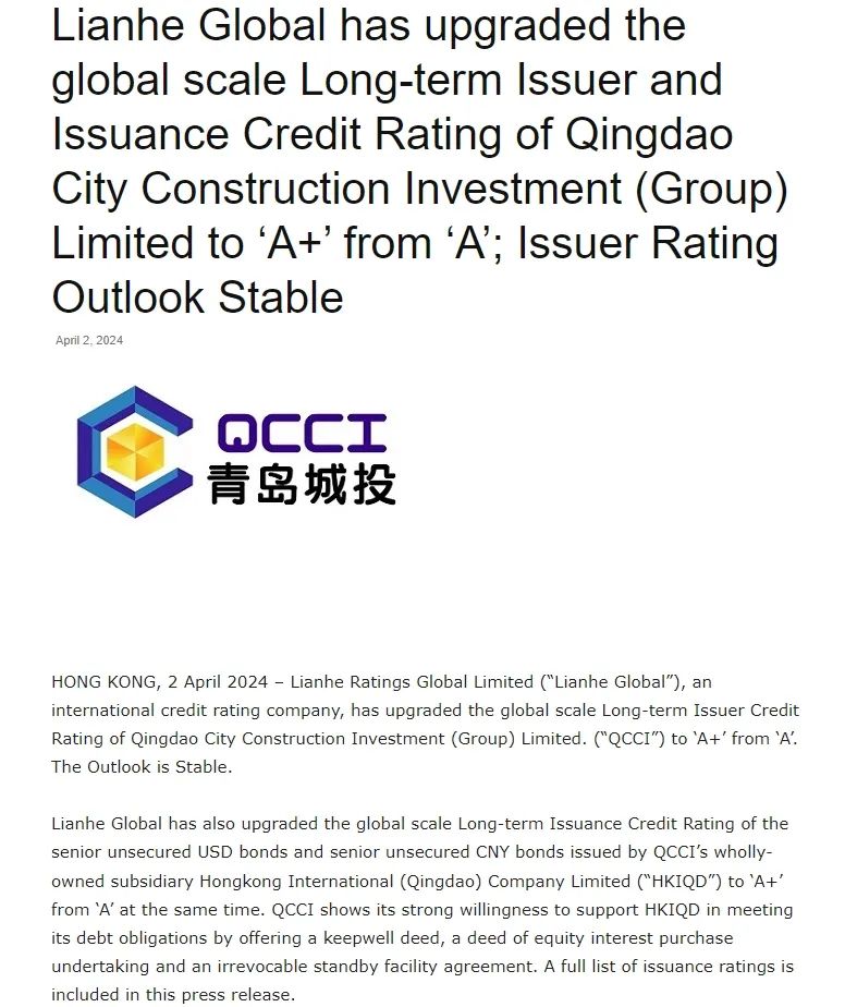 4月2日,權(quán)威評級機(jī)構(gòu)聯(lián)合國際正式宣布上調(diào)青島城投集團(tuán)國際長期發(fā)行人評級從‘A’上調(diào)至‘A+’,展望穩(wěn)定,同時將由青島城投全資子公司香港國際(青島)有限公司(“香港國際”)發(fā)行的高級無抵押美元債券和高級無抵押人民幣債券的國際長期發(fā)行債務(wù)評級從‘A’上調(diào)至‘A+’。