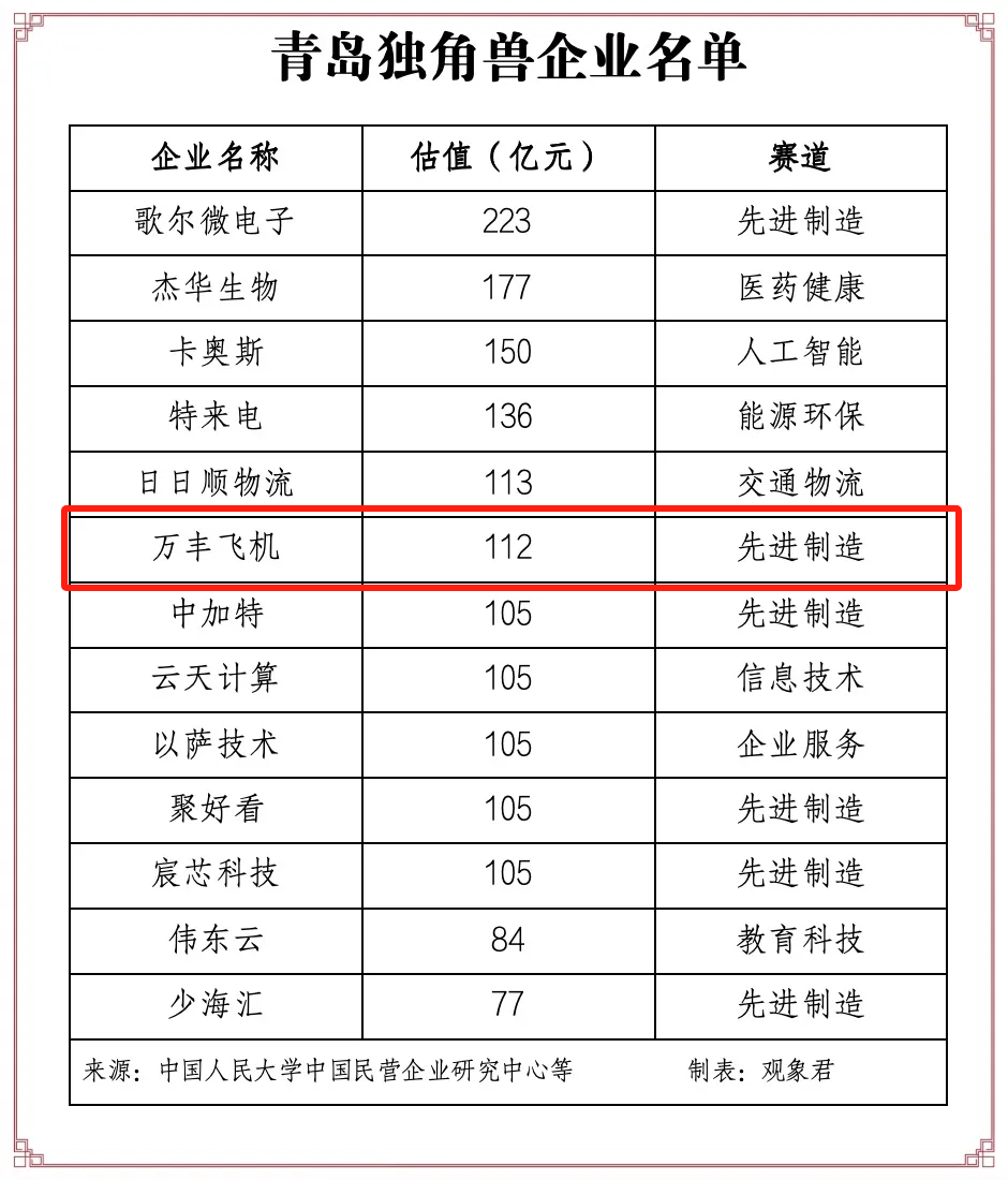 青島城投投資企業(yè)萬豐飛機(jī)蟬聯(lián)全球獨(dú)角獸企業(yè)500強(qiáng)