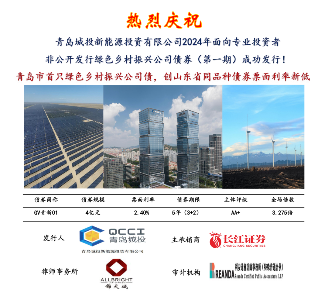 7月19日,青島城投新能源集團(tuán)成功以自身主體評(píng)級(jí)AA+、無(wú)擔(dān)保方式發(fā)行公司債券(GV青新01)。本期債券發(fā)行規(guī)模4億元,為青島市首只綠色鄉(xiāng)村振興公司債券,發(fā)行期限3+2年。本期債券發(fā)行共吸引了24家投資機(jī)構(gòu),全場(chǎng)認(rèn)購(gòu)倍數(shù)達(dá)3.275倍,票面利率2.4%,創(chuàng)山東省同品種債券利率新低。