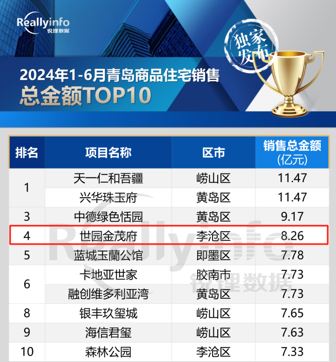 近日,銳理數據發(fā)布“青島房市年中榜”,青島城投集團世園·金茂府以8.26億銷售總金額榮登青島市2024上半年網簽金額第四名,穩(wěn)居李滄區(qū)第一名。