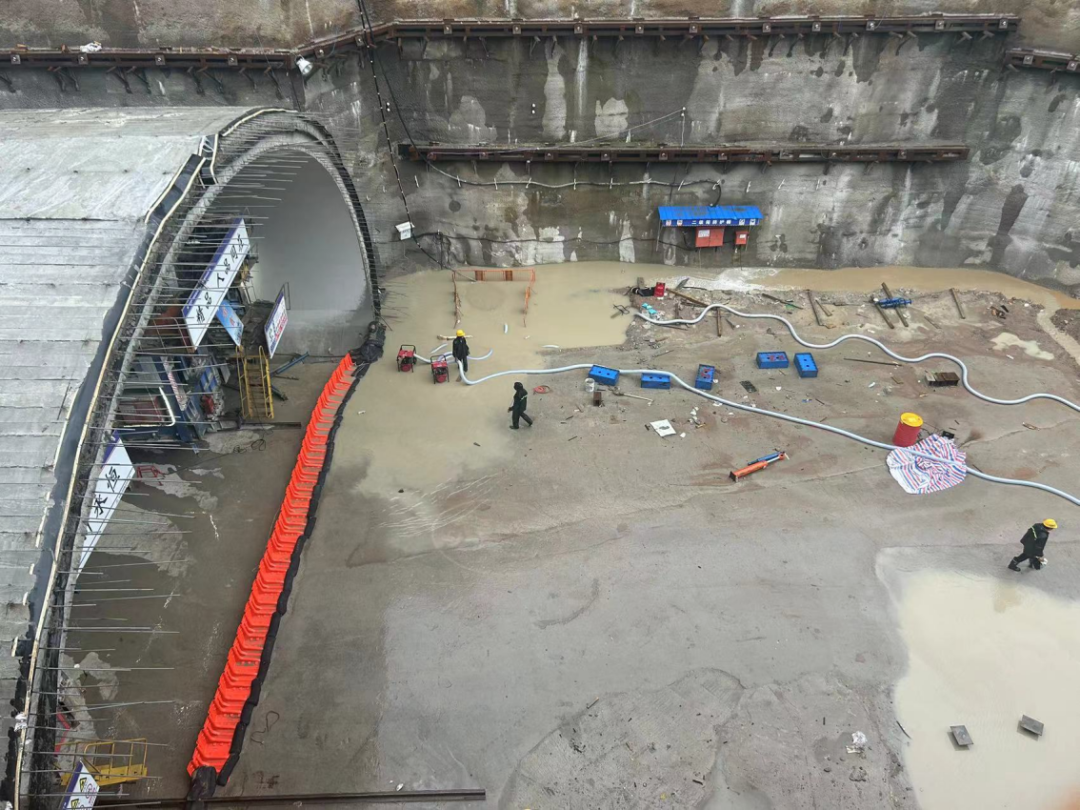 7月20日凌晨全市普降暴雨,交發(fā)集團立即對唐山路快速路工程項目頂管始發(fā)井接收井、隧道邊仰坡、地道調(diào)流路、橋梁基礎深基坑及隧道內(nèi)炸藥臨時存放處等關鍵安全區(qū)域開展夜間雨天安全巡查,并對應急物資準備情況進行檢查。因暴雨造成的調(diào)流路內(nèi)澇積水、邊仰坡排水不暢等問題,項目組立即組織人員、機械等作業(yè)力量緊急投入積水抽排工作,并同步組織人員加固施工圍擋、臨建設施和腳手架立桿基礎等設施,確保汛期施工現(xiàn)場安全平穩(wěn)有序。
