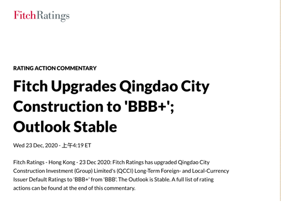 惠譽國際評級12月23日正式宣布,確認集團長期外幣及本幣發(fā)行人主體評級從“BBB”上調(diào)至“BBB+”,展望“穩(wěn)定”。惠譽認為,集團與青島市政府的關(guān)系進一步加強,將代表政府持有更多具有戰(zhàn)略性的重要資產(chǎn)。