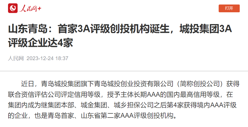 人民網(wǎng):山東青島首家AAA評級創(chuàng)投機(jī)構(gòu)誕生,城投集團(tuán)3A主體評級企業(yè)達(dá)4家