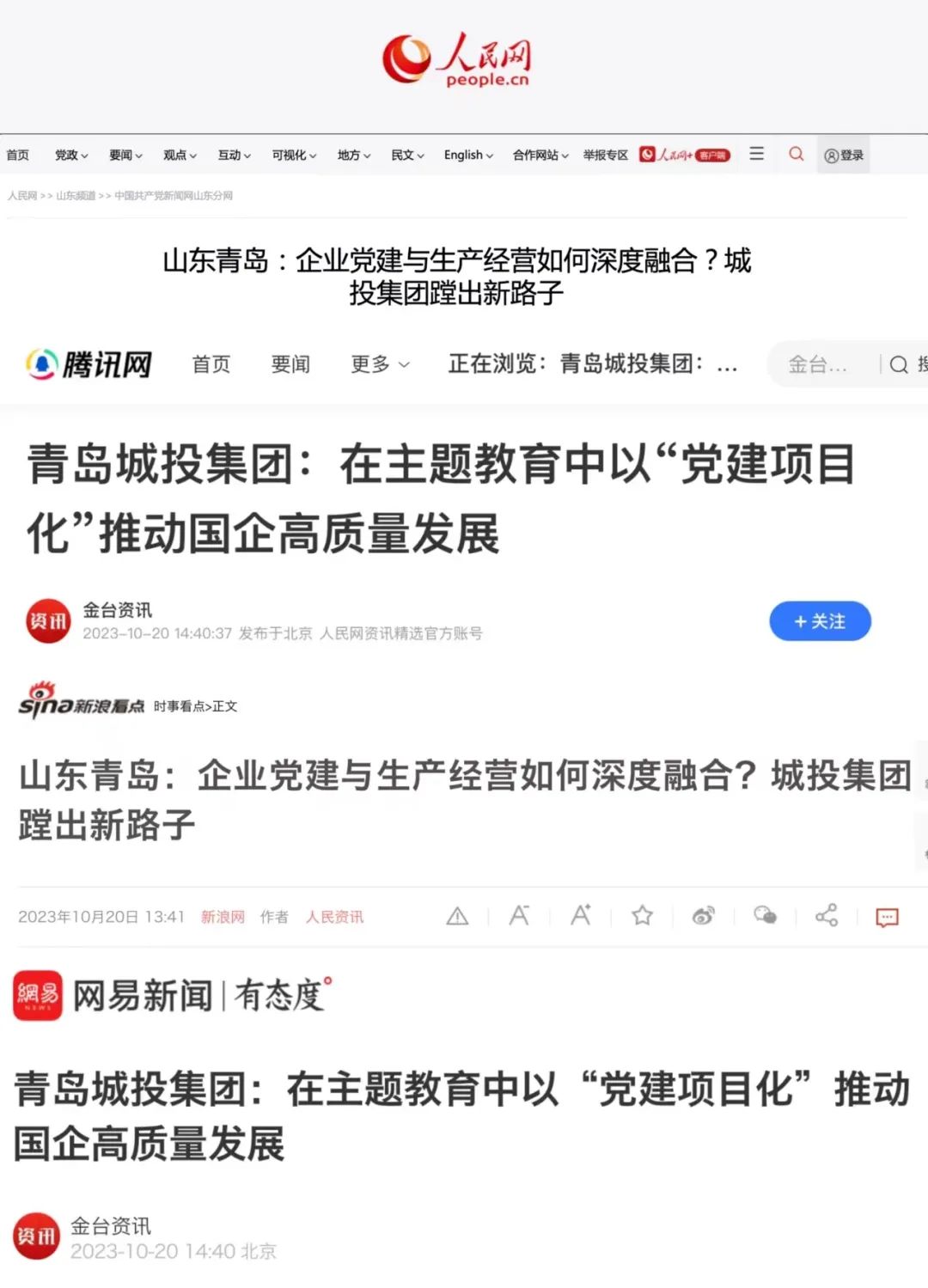 10月20日,人民日?qǐng)?bào)旗下人民網(wǎng)在中國共產(chǎn)黨新聞網(wǎng)、人民網(wǎng)港澳臺(tái)版、金臺(tái)資訊、騰訊網(wǎng)、網(wǎng)易新聞、新浪網(wǎng)等知名媒體平臺(tái)集中報(bào)道了《在主題教育中以“黨建項(xiàng)目化”推動(dòng)國企高質(zhì)量發(fā)展》《企業(yè)黨建與生產(chǎn)經(jīng)營如何深度融合?城投集團(tuán)蹚出新路子》兩篇文章16次。青島城投集團(tuán)“黨建項(xiàng)目化”的創(chuàng)新做法,為國有企業(yè)破解黨建經(jīng)營“兩張皮”難題給出“城投答案”,在互聯(lián)網(wǎng)引發(fā)熱烈反響。
