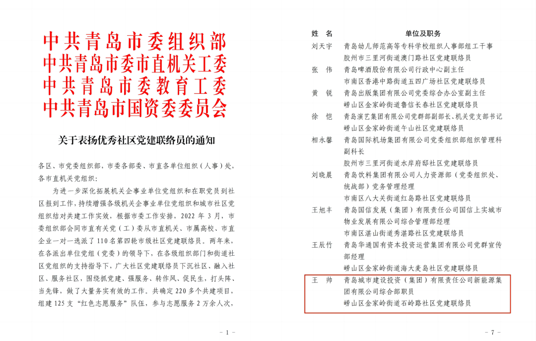 近日,市委組織部、市直機關(guān)工委、市委教育工委、市國資委四部門聯(lián)合行文《關(guān)于表揚優(yōu)秀社區(qū)黨建聯(lián)絡(luò)員的通知》對青島城投新能源集團王帥同志等55名優(yōu)秀社區(qū)黨建聯(lián)絡(luò)員進行了表彰。2022年以來,城投集團與金家?guī)X街道石嶺路社區(qū)開展黨建結(jié)對共建“雙報到”,本次表彰再次體現(xiàn)了有關(guān)部門對集團黨建共建工作的高度評價。