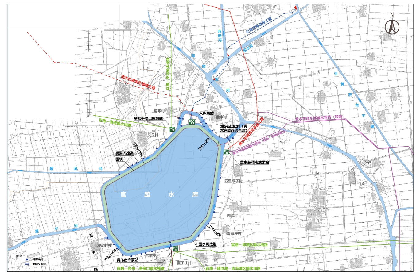 工程位于青島膠州市西北的墨水河下游,北距平度市城區(qū)30km,南距膠州市城區(qū)15km,西距高密市城區(qū)18km。工程主要任務(wù)是近期調(diào)蓄黃水東調(diào)工程水量、當(dāng)?shù)赜旰樗Y源以及引黃濟(jì)青干渠輸送的山東省統(tǒng)籌調(diào)配的客水,為青島市城鎮(zhèn)生活及工業(yè)用水提供水源;遠(yuǎn)期在雨洪水和黃水東調(diào)水量基礎(chǔ)上,新增調(diào)蓄山東省統(tǒng)籌調(diào)配的南水北調(diào)等客水,滿足青島供水需求,并兼顧高密市的部分用水需求。工程規(guī)模為大(2)型,共涉及膠州市、高密市、平度市三個(gè)縣級市。水庫總庫容2.11億立方米,死庫容0.19億立方米 ,興利庫容1.92億立方米。總投資約91.45億元,主要建筑物包括水庫圍壩、入庫泵站、青島出庫泵站、高密出庫泵站、泄水洞、墨水河及順溪河改道、引黃濟(jì)青連接暗渠等,項(xiàng)目建設(shè)期3年。