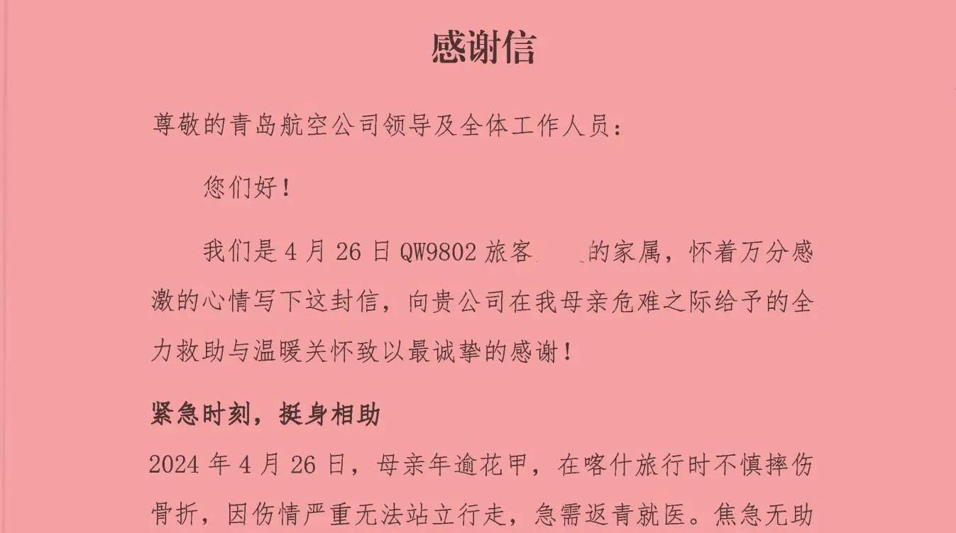 近日,一封含“贊”量滿滿的感謝信被專程送到了青島城投集團(tuán)旗下青島航空的值機(jī)柜臺。信中,旅客家屬用“雪中送炭的人間大愛”形容這段跨越千里的護(hù)航之旅,字里行間流淌的真情,讓這封不足千字的信件成為青島航空真情服務(wù)的最佳見證。(圖為乘客發(fā)來感謝信)4月26日,年逾花甲的旅客萬女士在喀什旅行時不慎摔傷骨折,因傷情嚴(yán)重?zé)o法站立行走,需搭乘青島航空QW9802航班返青就醫(yī),家屬在焦急無助之際聯(lián)系青島航空求助。接到旅客求