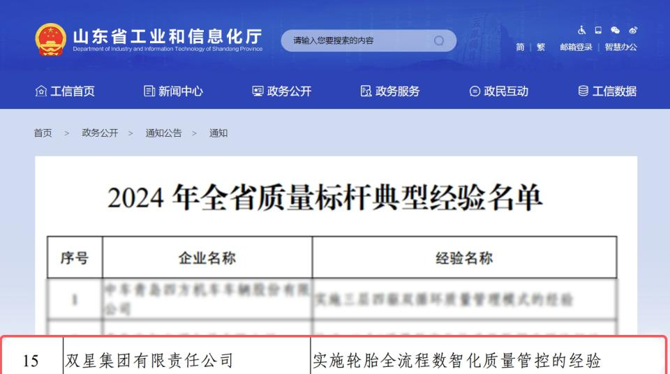 近日,山東省工業(yè)和信息化廳公布2024年全省質(zhì)量標(biāo)桿典型經(jīng)驗(yàn)名單,雙星集團(tuán)“實(shí)施輪胎全流程數(shù)智化質(zhì)量管控的經(jīng)驗(yàn)”案例成功入選,成為輪胎行業(yè)唯一入選企業(yè),彰顯了雙星在數(shù)智化質(zhì)量管理中的示范引領(lǐng)作用。(圖為2024年全省質(zhì)量標(biāo)桿典型經(jīng)驗(yàn)名單)為貫徹落實(shí)省委、省政府《關(guān)于聚力推動(dòng)工業(yè)經(jīng)濟(jì)高質(zhì)量發(fā)展十大行動(dòng)的意見(jiàn)》部署要求,加快提升工業(yè)品質(zhì)量品牌,加強(qiáng)質(zhì)量支撐,推動(dòng)制造業(yè)高質(zhì)量發(fā)展,省工業(yè)和信息化廳組織開(kāi)展了202