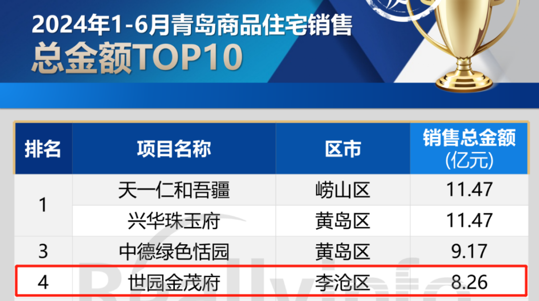 近日,銳理數(shù)據(jù)發(fā)布“青島房市年中榜”,青島城投集團(tuán)世園·金茂府以8.26億銷(xiāo)售總金額榮登青島市2024上半年網(wǎng)簽金額第四名,穩(wěn)居李滄區(qū)第一名。