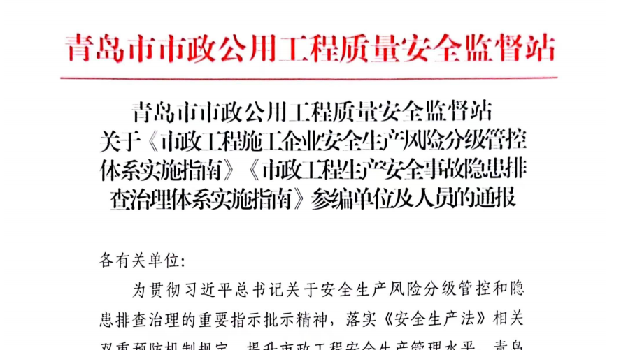 “標準決定質量,有什么樣的標準就有什么樣的質量,只有高標準才有高質量?!鼻鄭u城投集團深入學習貫徹習近平總書記關于安全生產、標準化工作的重要論述精神,近日,城投集團與青島市市政工程質量安全監(jiān)督站共同主編兩項省級行業(yè)團體標準《市政工程安全事故隱患排查治理體系實施指南》(以下簡稱《隱患排查指南》)《市政工程施工企業(yè)安全生產風險分級管控體系實施指南》(以下簡稱《風險管控指南》),已正式發(fā)布實施。(圖為兩