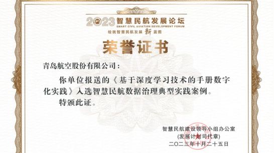 近日,2023年智慧民航發(fā)展論壇在北京舉辦,青島城投旗下青島航空獲得民航局頒發(fā)的“智慧民航典型案例”榮譽(yù)證書(shū),成為此次評(píng)選航空運(yùn)輸單位入選的10個(gè)案例之一。這是繼2022年度民航數(shù)據(jù)共享數(shù)字化能力指數(shù)(DCI)排名第一后,青島航空的信息化建設(shè)工作再次獲得我國(guó)民航業(yè)權(quán)威獎(jiǎng)項(xiàng) 。(圖為榮譽(yù)證書(shū))近年來(lái),青島航空充分發(fā)揮城投集團(tuán)產(chǎn)業(yè)協(xié)同優(yōu)勢(shì),與集團(tuán)旗下數(shù)字科技公司密切聯(lián)動(dòng),數(shù)字化轉(zhuǎn)型工作成果卓著。此次獲獎(jiǎng),青島航空結(jié)